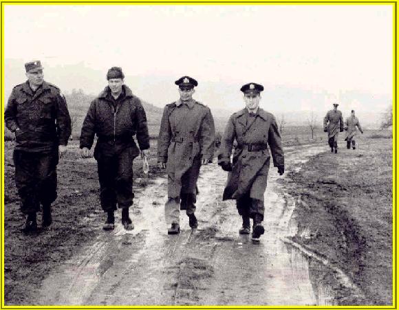 This is the climax of a border incident where the pilot of an OH 1 chopper and his passenger got lost and landed in the East Zone. They were held for better than a week. Ted Cohen had to go down to the border, cross into the East Zone on invite of the Soviets and sign for their release. As soon as they crossed back into the U.S., zone the captain from Seventh Army took over control and away they went. The three bringing up the rear were from the 529 MI detachment in Fulda. An army photographer took this photo, the following is the caption: "Hdqtrs Seventh Army, Public Info Office, APOP 46 NYC,NY "Alsleben-Gompertshausen Area (March 24, 1955) L-R Herr Horst Kuehn, German Labor Servce employee; 1st Lt Lewis E. Jacquay, 97 th Sig Opns Bn; Capt. T.J Girouard, Hqs 7th Army, 1st Lt Theodore S. Cohen, Hqs 14th Armd Cav, walk away from East-West border barrier vicinity Alsleben after Lt Jacquay and Kuehn were released from Soviets."